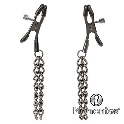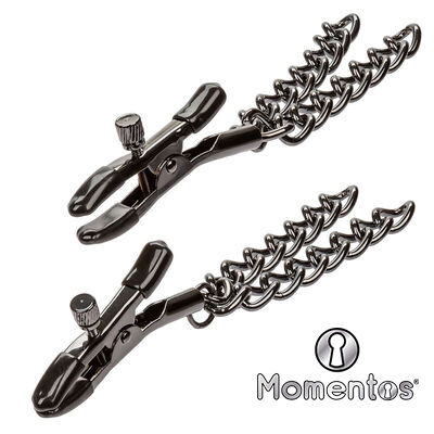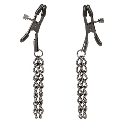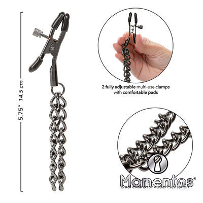 Las almohadillas suaves brindan un abrazo suave, ampliando el reino del juego sensorial. Las cadenas dobles caen graciosamente desde cada abrazadera, amplificando las sensaciones con cada movimiento. Fabricadas con acentos metálicos libres de níquel, garantizan una seducción sin preocupaciones.