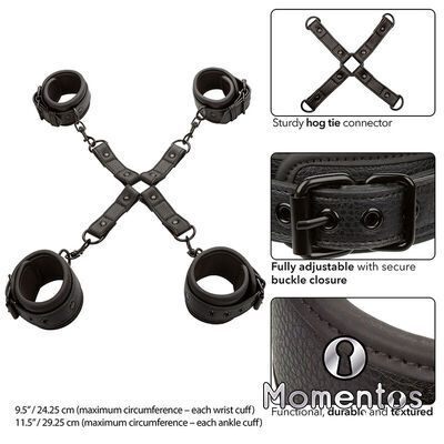 En el núcleo se encuentra el resistente conector hog tie, que permite diversas posiciones y niveles de restricción. Los cierres universales y un anillo D giratorio mejoran la destreza. Doblemente cosido para mayor durabilidad, garantiza longevidad. El acabado texturizado añade placer sensorial. Versátil, puede desmontarse para usar los puños individualmente.