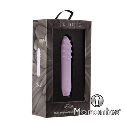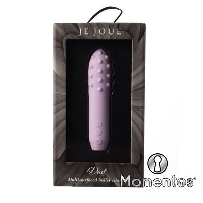 Conoce a Duet, una bala vibradora de múltiples superficies con puntos de placer pequeños, redondeados y graduados en un lado y una superficie suave como la seda en el otro para brindar múltiples sensaciones en todo el cuerpo. Use Duet para estimular los puntos de placer externos como el clítoris, los pezones y los muslos. Y si quieres explorar más, Duet es el compañero perfecto para jugar con una penetración suave y superficial con sus vibraciones profundamente ricas. Con su silicona de grado médico, suave como la seda y segura para el cuerpo, Duet se siente genial al tacto y aún mejor al experimentarlo. Deje que los famosos motores ruidosos de Je Joue mimen su cuerpo más profundamente, brindándole una experiencia íntima más rica y placentera.