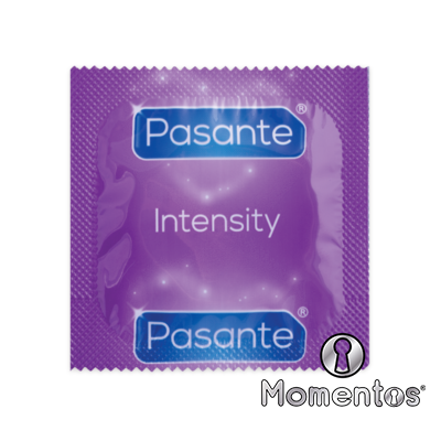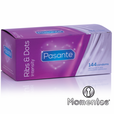 Los condones Pasante Ribs & Dots Intensity son condones cónicos, texturizado con nervaduras pronunciadas y puntos. De color natural.
