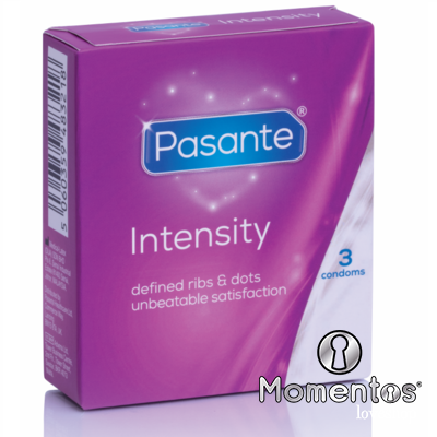 Los condones Pasante Ribs & Dots Intensity son condones cónicos, texturizado con nervaduras pronunciadas y puntos. De color natural.
