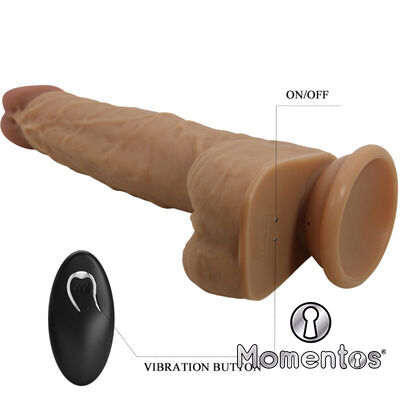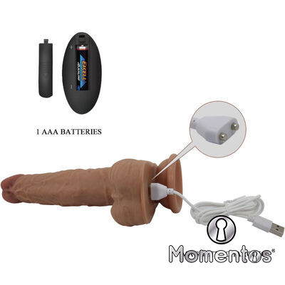 Un vibrador de empuje y vibración con forma de pene realista con una fuerte ventosa que se adhiere a cualquier superficie lisa. La ventosa hace posible la diversión con manos libres. Los 3 modos de vibración y empuje se pueden controlar por separado mediante el mando a distancia o por un compañero. El dador de placer, que empuja y vibra, está cubierto de silicona suave que se siente muy bien contra la piel. El vibrador realista es excitantemente firme y duro sin perder flexibilidad gracias a este material. El material de silicona suave y sedoso parece piel real y también se siente tan suave como el terciopelo. Se puede recargar con el puerto de carga magnético en el extremo del juguete