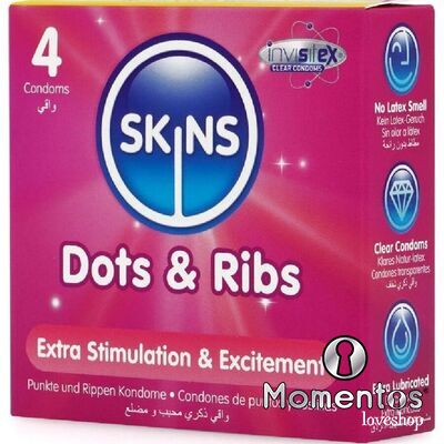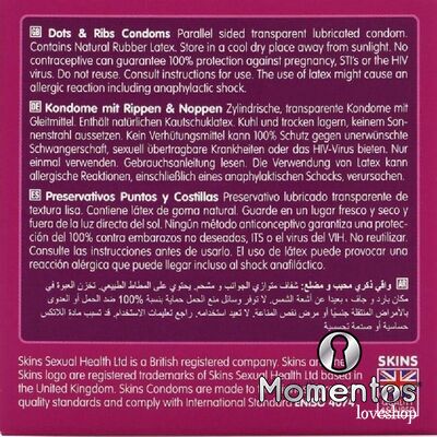 Skins ha combinado nervaduras elevadas ubicadas estratégicamente para brindar mayor placer al usuario junto con puntos deliciosamente delicados para brindar una mayor sensación a la pareja, trabajando en armonía para maximizar el placer y el disfrute de ambos durante esos momentos íntimos. Los condones Skins Dots & Ribs están fabricados con látex natural de primera calidad para una sensación transparente, mejorada y resistente. ¡Tan finos que se sienten como una segunda piel! ¡Nunca entres sin un Skin!