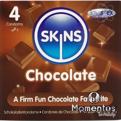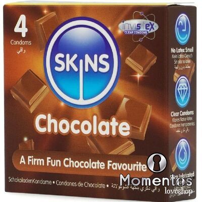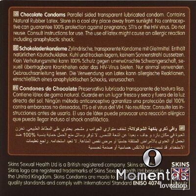 Presentamos nuestro nuevo paquete de 4 con sabor a chocolate, con un diseño elegante y listo para usar, y hasta un 33 % más de condones que el líder del mercado. Atrae a quienes buscan un producto íntimo divertido y de alta calidad con los condones Skins sabor chocolate. Estos condones envueltos individualmente combinan un sabor placentero con una protección superior, lo que los convierte en la opción ideal para tiendas de productos para adultos, farmacias y distribuidores de productos de bienestar. Estos condones Skins son una excelente manera de combinar dos amores: el sexo y el chocolate. Están lubricados y tienen un delicioso aroma a chocolate, realmente tentador, y además saben a chocolate. Como todos los condones Skins, están hechos de látex de alta calidad, dermatológicamente probado, que te brindará la protección que necesitas.