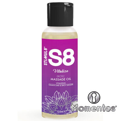 Estos ricos aceites de masaje S8 son una mezcla única de 3 potentes aceites: aceite de jojoba que calma y fortalece la piel, aceite de almendras para hidratar y cuidar, y aceite de sésamo, altamente nutritivo y lubricante. Este aceite S8 está enriquecido con vitaminas y minerales esenciales. Después de un buen masaje, su piel se sentirá sedosa, suave y relajada. Hay 3 aromas diferentes disponibles: Vitalize - Lima Omaní y Jengibre Picante, Relax - Té Verde y Flor de Lila y Refresh - Ciruela Francesa y Algodón Egipcio.