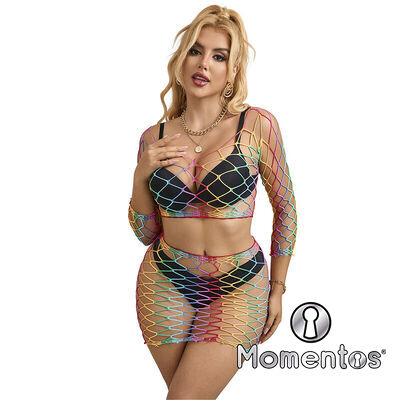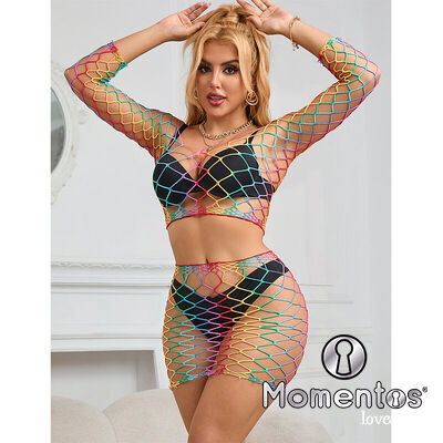 Este body de rejilla en dos piezas con colores arcoíris es una prenda que equilibra perfectamente estilo, comodidad y versatilidad.