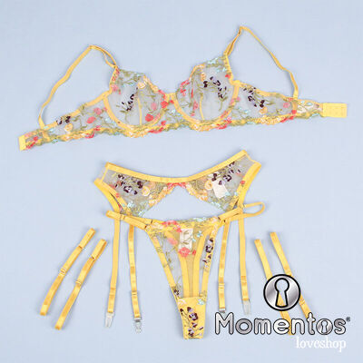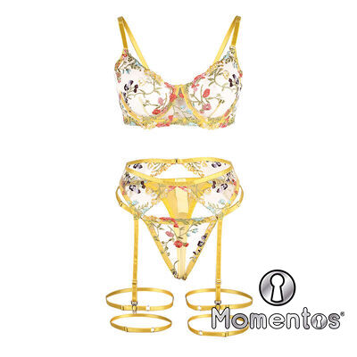 SUBBLIME - 954352 BRA + THONG + GARTER BELT FLORAL DESIGN YELLOW L/XL