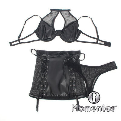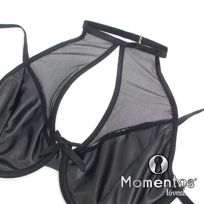 Este set de lencería en efecto cuero (PU leather) y malla translúcida crea un equilibrio perfecto entre provocación y elegancia. El diseño halter resalta los hombros y el escote de manera llamativa, mientras que el material de vinilo le da un toque de rebeldía y poder. Los detalles en malla añaden transparencias estratégicas que insinúan la piel de forma seductora, fusionando lo atrevido con lo sofisticado.